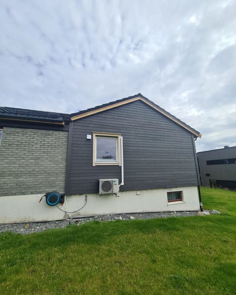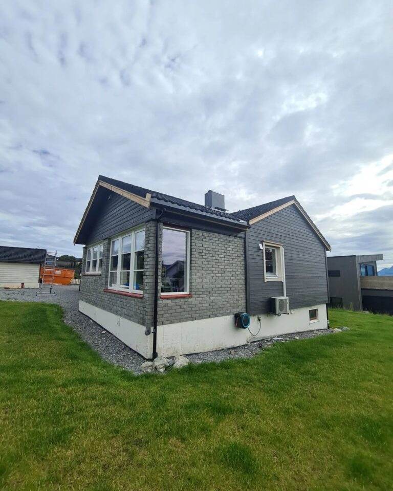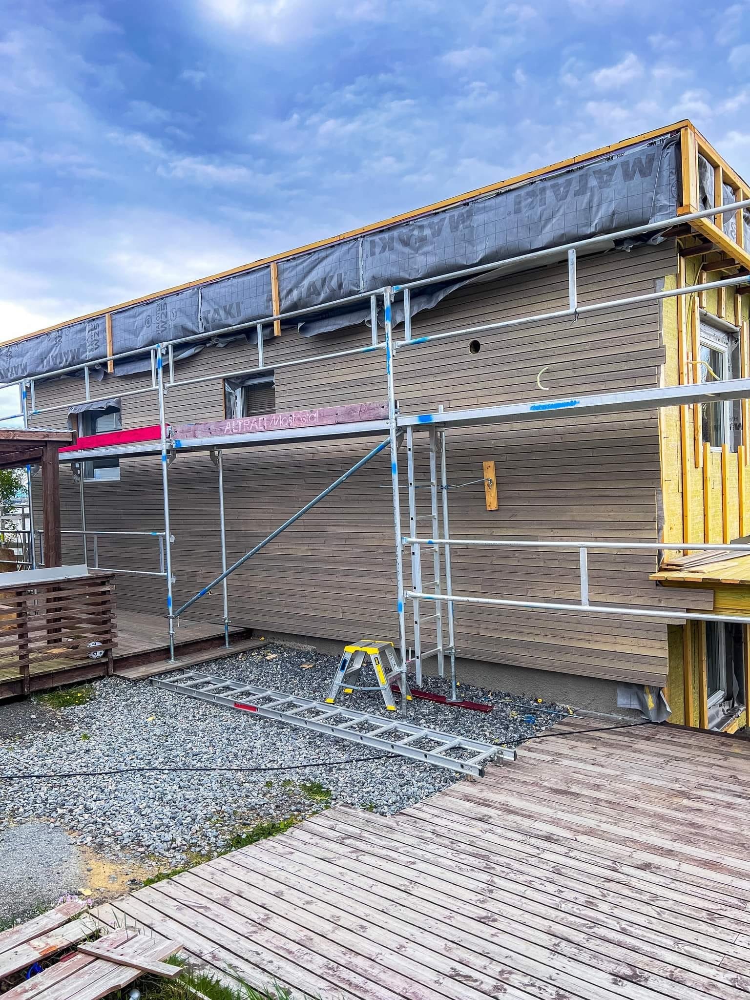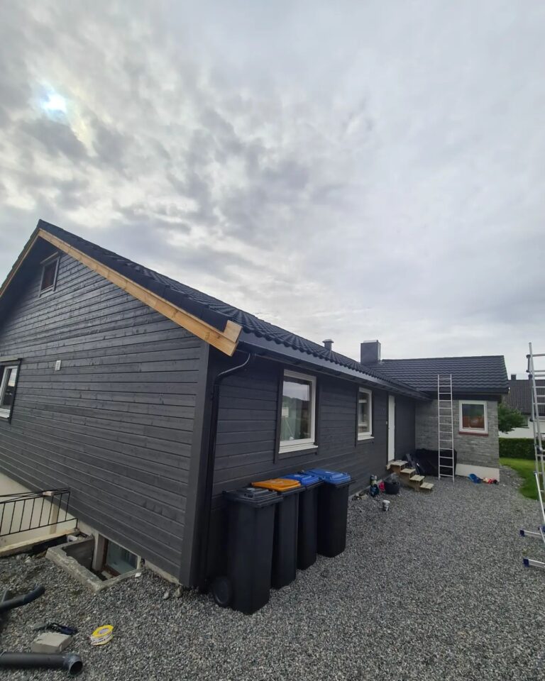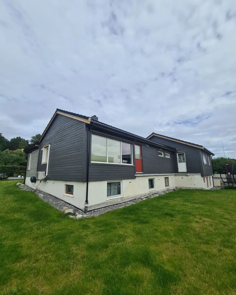 Her skiftet vi vinduer, tilleggsisolerte med Rockwool RedAir Flex, skiftet bordkledning, byggde ny altan og trapper