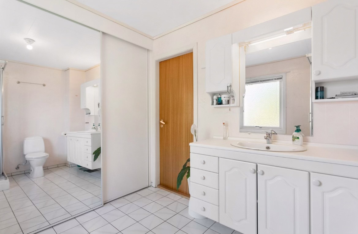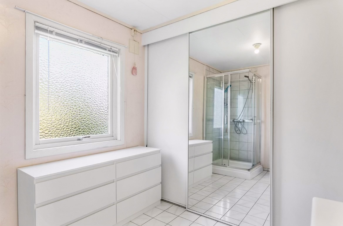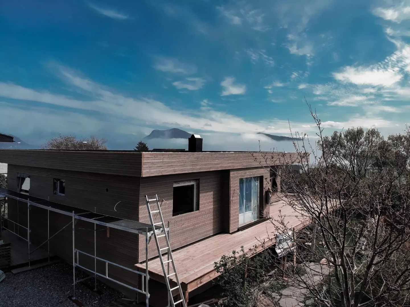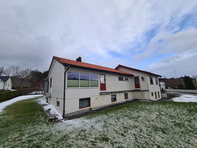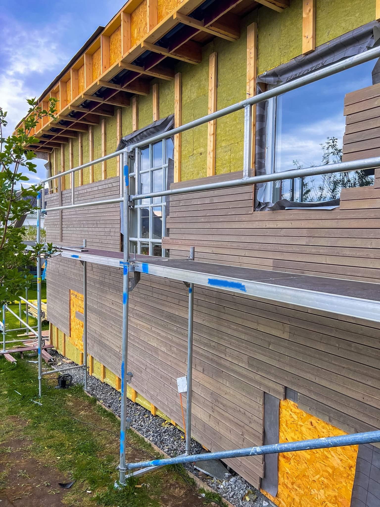 Her skiftet vi vinduer, tilleggsisolerte med Rockwool RedAir Flex, skiftet bordkledning, byggde ny altan og trapper